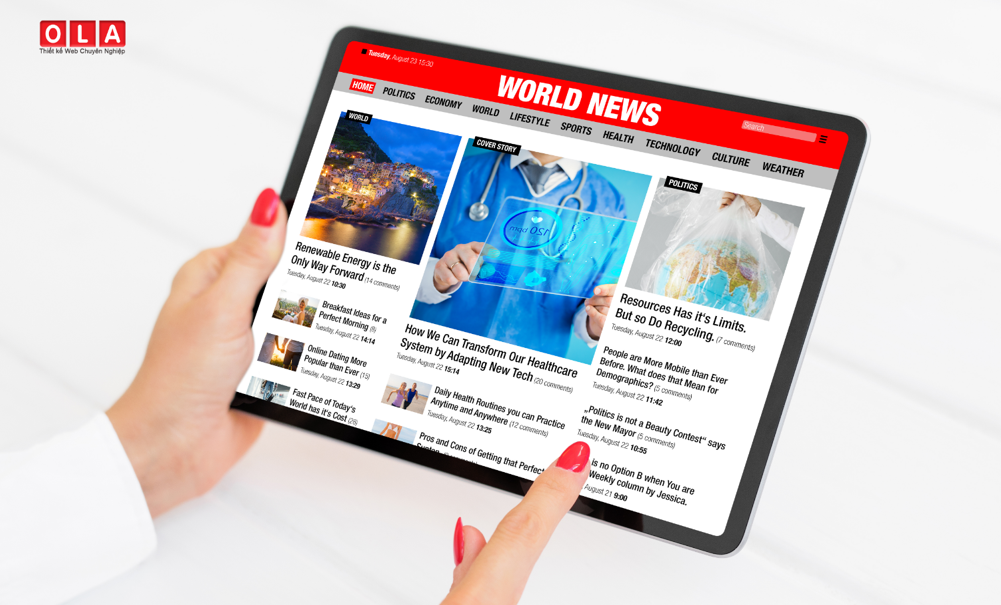 Thiết kế một website tin tức chuyên nghiệp không chỉ giúp bạn cung cấp thông tin kịp thời mà còn tạo ra cơ hội kiếm tiền và xây dựng thương hiệu. Để có một website tin tức hiệu quả và nổi bật trên thị trường, hãy liên hệ với OLA - công ty thiết kế web với hơn nhiều năm kinh nghiệm. Chúng tôi cam kết mang đến cho bạn một trang web tin tức chất lượng cao, được tùy chỉnh theo nhu cầu cụ thể của bạn và tối ưu hóa toàn diện để thu hút nhiều độc giả và tạo dấu ấn trên thị trường.
